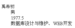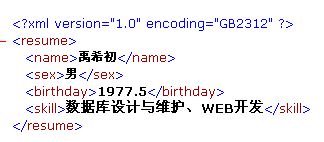 <?xml version="1.0" encoding="GB2312"?> <resume> <name>禹希初</name> <sex>男</sex> <birthday>1977.5</birthday> <skill>數據庫設計與維護、WEB開發</skill> </resume>