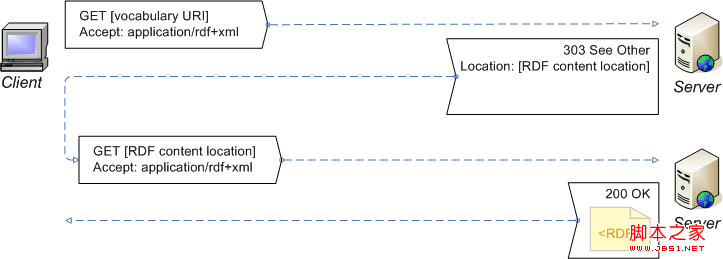 •但對于語義瀏覽器,其HTTP請求頭是:application/rdf+xml類型,故服務器進行303重定向,得到相應RDF文件。
