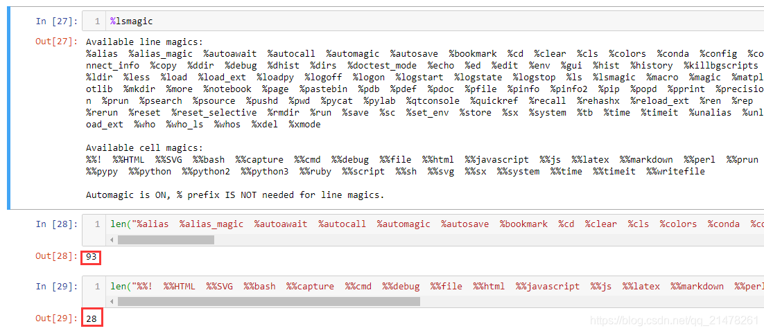 Available line magics:【對當(dāng)前行使用共計93個】%alias %alias_magic %autoawait %autocall %automagic %autosave %bookmark %cd %clear %cls %colors %conda %config %connect_info %copy %ddir %debug %dhist %dirs %doctest_mode %echo %ed %edit %env %gui %hist %history %killbgscripts %ldir %less %load %load_ext %loadpy %logoff %logon %logstart %logstate %logstop %ls %lsmagic %macro %magic %matplotlib %mkdir %more %notebook %page %pastebin %pdb %pdef %pdoc %pfile %pinfo %pinfo2 %pip %popd %pprint %precision %prun %psearch %psource %pushd %pwd %pycat %pylab %qtconsole %quickref %recall %rehashx %reload_ext %ren %rep %rerun %reset %reset_selective %rmdir %run %save %sc %set_env %store %sx %system %tb %time %timeit %unalias %unload_ext %who %who_ls %whos %xdel %xmode Available cell magics:【對當(dāng)前cell使用共計28個】%%! %%HTML %%SVG %%bash %%capture %%cmd %%debug %%file %%html %%javascript %%js %%latex %%markdown %%perl %%prun %%pypy %%python %%python2 %%python3 %%ruby %%script %%sh %%svg %%sx %%system %%time %%timeit %%writefile
