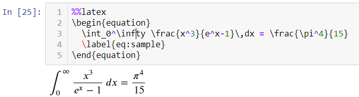 %%latex\begin{equation} \int_0^\infty \frac{x^3}{e^x-1}\,dx = \frac{\pi^4}{15} \label{eq:sample}\end{equation}