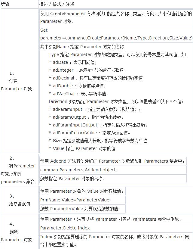 Command 對象具有由 Parameter 對象組成的 Parameters 集合,Parameter 對象代表與基于參數(shù)化查詢或存儲過程的 Command 對象相關(guān)聯(lián)的參數(shù)或自變量。通過創(chuàng)建 Parameter 對象并添加到 Parameter 集合中,可以向參數(shù)化查詢傳遞所需要的數(shù)據(jù)。使用 Parameter 集合的步驟如表下: