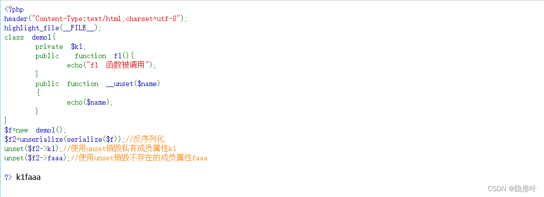 <?phpheader("Content-Type:text/html;charset=utf-8");highlight_file(__FILE__);class demo1{ private $k1; public function f1(){echo("f1 函數被調用"); } public function __unset($name) {echo($name); }}$f=new demo1();$f2=unserialize(serialize($f));//反序列化unset($f2->k1);//使用unset銷毀私有成員屬性k1unset($f2->faaa);//使用unset銷毀不存在的成員屬性faaa?>輸出結果