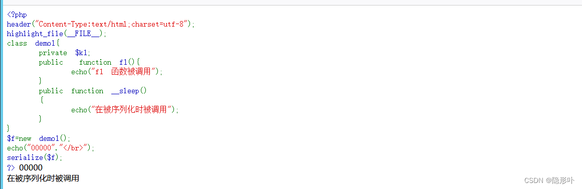 <?phpheader("Content-Type:text/html;charset=utf-8");highlight_file(__FILE__);class demo1{ private $k1; public function f1(){echo("f1 函數被調用"); } public function __sleep() {echo("在被序列化時被調用"); }}$f=new demo1();echo("00000"."</br>");serialize($f);?>輸出結果