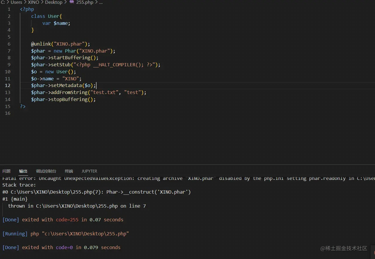 <?php class User{var $name; } @unlink("XINO.phar"); $phar = new Phar("XINO.phar"); $phar->startBuffering(); $phar->setStub("<?php __HALT_COMPILER(); ?>"); $o = new User(); $o->name = "XINO"; $phar->setMetadata($o); $phar->addFromString("test.txt", "test"); $phar->stopBuffering();?>運行之后結(jié)果如下: