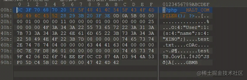 成功生成了名為XINO.phar的phar類型文件,我們放進010editor查看: