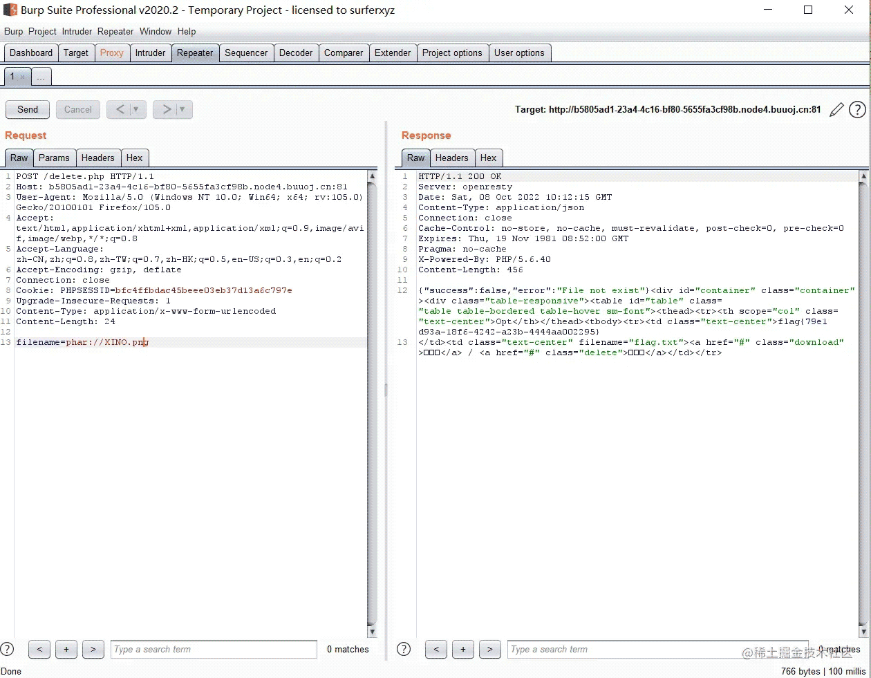 <?php#delete.phpsession_start();if (!isset($_SESSION["login"])) { header("Location: login.php"); die();}if (!isset($_POST["filename"])) { die();}include "class.php";chdir($_SESSION["sandbox"]);$file = new File();$filename = (string) $_POST["filename"];if (strlen($filename) < 40 && $file->open($filename)) { $file->detele(); Header("Content-type: application/json"); $response = array("success" => true, "error" => ""); echo json_encode($response);} else { Header("Content-type: application/json"); $response = array("success" => false, "error" => "File not exist"); echo json_encode($response);}?>簡單分析一下: