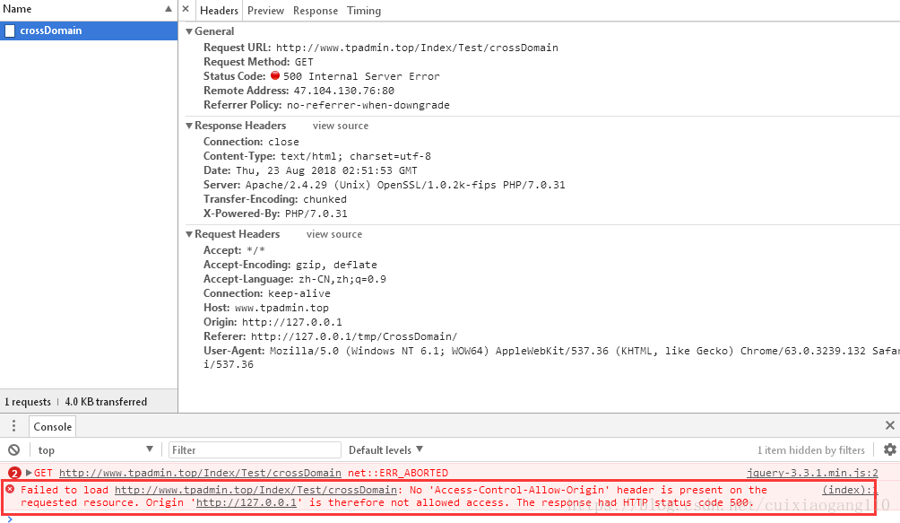 $("#demo1").click(function(){ $.ajax({url : "http://www.tpadmin.top/Index/Test/crossDomain",data : {},type : "get",success : function (res) { //No "Access-Control-Allow-Origin" header is present on the requested resource. Origin "http://127.0.0.1" is therefore not allowed access. 在執(zhí)行時(shí)候報(bào)出的錯(cuò)誤,這代表了跨域錯(cuò)誤 alert(res);} });});?