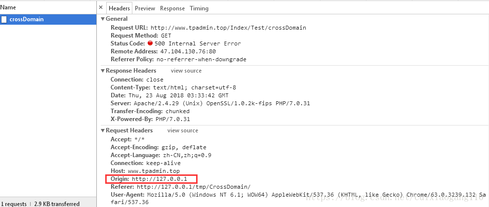 這時(shí)我們發(fā)現(xiàn)跨域訪問的請(qǐng)求頭中存在Origin的字段,用來記錄當(dāng)前的訪問域名,我們可以再服務(wù)端增加一個(gè)響應(yīng)頭Access-Control-Allow-Origin來告訴瀏覽器我們支持它獲取就可以了,代碼實(shí)現(xiàn):