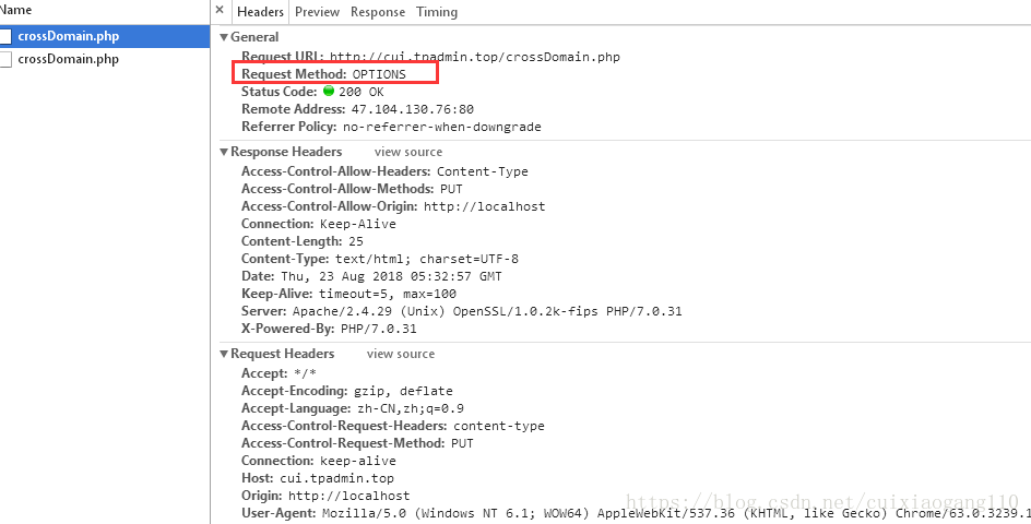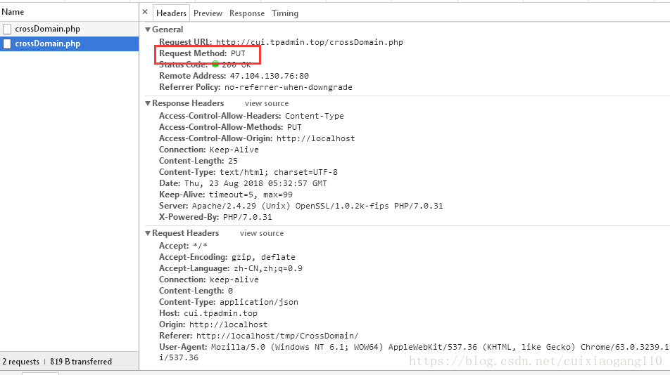 <?phpheader("Access-Control-Allow-Headers:Content-Type");header("Access-Control-Allow-Methods:PUT");//看這里header("Access-Control-Max-Age:3600");$requestHeader = getallheaders();$origin = isset($requestHeader["Origin"])?$requestHeader["Origin"]:"";switch ($origin) { case "http://127.0.0.1":header("Access-Control-Allow-Origin:http://127.0.0.1");break; case "http://localhost":header("Access-Control-Allow-Origin:http://localhost");break; default:break;}$arr = ["code" => 200, "name" => "cui"];echo $data = json_encode($arr);?>