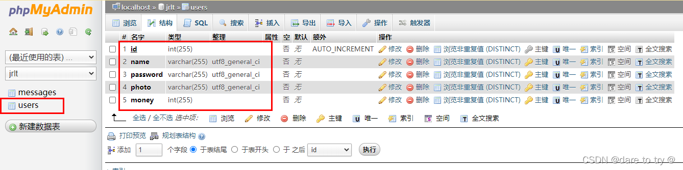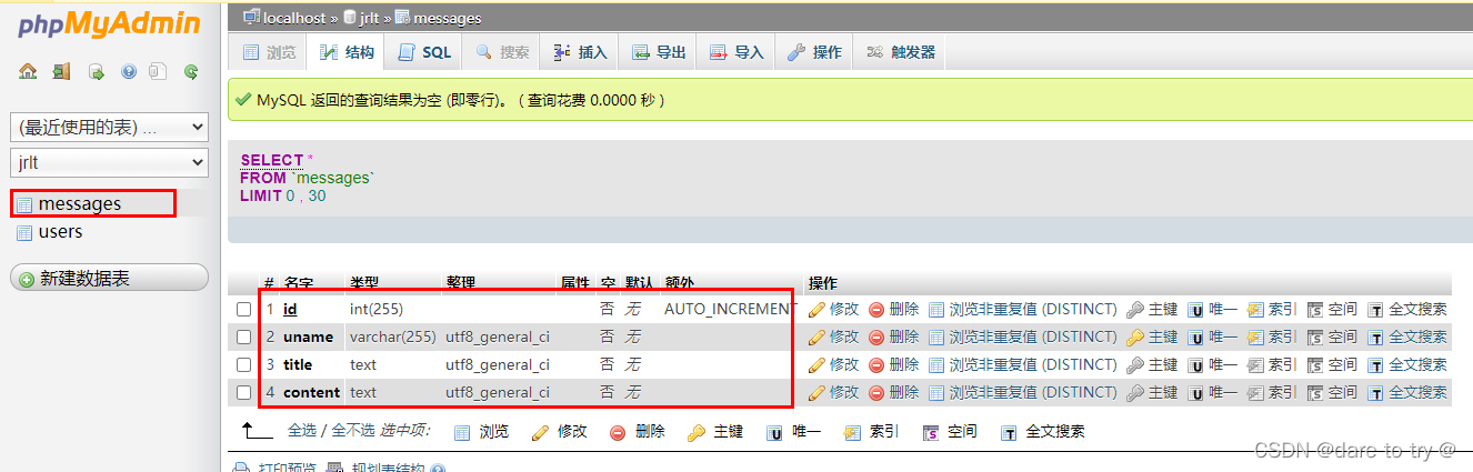 (2)在該數據庫下創建兩個表,一個是users,一個是messages,所含字段分別如下: