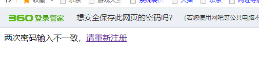 ② 若兩次密碼不一致,則返回注冊頁面并提示“兩次密碼輸入不一致”;