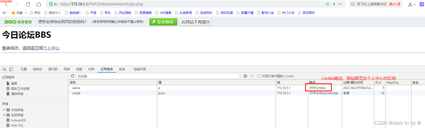 setcookie設置路徑:設置成 ‘/’ 時,為網站默認路徑,Cookie 對整個域名 domain 有效。 如果設置成 ‘/PHP/’, Cookie 僅僅對 domain 中 /PHP/ 目錄及其子目錄有效。 設置 Cookie 時的默認值為代碼文件所在的當前目錄。因此,為了讓網站首頁也能獲取到cookie,需要設置路徑為/PHP/jrltbbs。