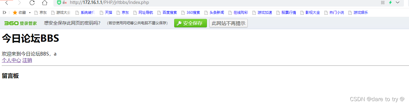 <html><head> <meta charset="utf-8"> <title> 首頁----今日論壇</title></head><body> <h1>今日論壇BBS</h1> <?php if(isset($_COOKIE["name"])){echo "歡迎來到今日論壇BBS,".$_COOKIE["name"]."<br/>";echo "<a href="./member/index.php">個人中心</a> ";echo "<a href="./member/logout.php">注銷</a>"; }else{ echo " <a href="./member/register.php">注冊</a> ";echo "<a href="./member/login.php">登錄</a> "; } ?> <hr/> <h3>留言板</h3></body></html>3.3 個人中心注冊頁面./member/register.php