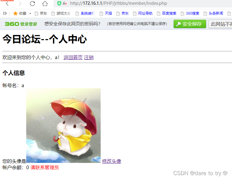 <?php include "../inc/dblink.inc.php"http://將數據庫連接的文件包含到此文件中?><html><head> <meta charset="utf-8"> <title>今日論壇--個人中心</title></head><body> <h1>今日論壇--個人中心</h1> <?php if(isset($_COOKIE["name"])){$userName=$_COOKIE["name"];$sql="select * from users where name="". $userName.""";if($results=mysqli_query($link,$sql)){ if(mysqli_num_rows($results)>0){$result=mysqli_fetch_assoc($results);echo "<hr/>";echo "歡迎來到您的個人中心,".$_COOKIE["name"] ."! <a href="../index.php">返回首頁</a> ";echo "<a href="./logout.php">注銷</a><br/>";echo "<hr/>";echo "<h3>個人信息</h3>";echo "帳號名:".$_COOKIE["name"] ."<br/>";echo "您的頭像是<img src="".$result["photo"].""/> ";echo "<a href="./updatePhoto.php">修改頭像</a> <br/>";echo "帳戶余額:".$result["money"]." <span style="color:red;">請聯系管理員</span>"; }else{die("該用戶不存在"); }}else{ die("sql語句有誤");} }else{echo "<a href="./login.php">請登錄</a>"; } ?></body></html><?php mysqli_close($link);?>3.7 登錄頁面 ./member/login.php
