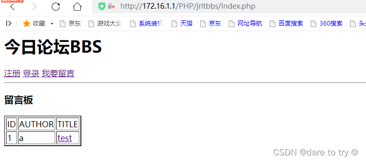 <?phpinclude "./inc/dblink.inc.php"http://將數據庫連接的文件包含到此文件中?><html><head> <meta charset="utf-8"> <title> 首頁----今日論壇</title></head><body> <h1>今日論壇BBS</h1> <?php if(isset($_COOKIE["name"])){echo "歡迎來到今日論壇BBS,".$_COOKIE["name"]."<br/>";echo "<a href="./member/index.php">個人中心</a> ";echo "<a href="./member/logout.php">注銷</a> "; }else{ echo " <a href="./member/register.php">注冊</a> ";echo "<a href="./member/login.php">登錄</a> "; } echo "<a href="./addMessage.php">我要留言</a>"; ?> <hr/> <h3>留言板</h3> <?php $sql="select * from messages"; if($results=mysqli_query($link,$sql)){if(mysqli_num_rows($results)>0){ echo "<table border=2>"; echo "<tr><td>ID</td><td>AUTHOR</td><td>TITLE</td></tr>"; while($result=mysqli_fetch_assoc($results)){echo "<tr><td>{$result["id"]}</td><td>{$result["uname"]}</td><td><a href="showmessage.php?id={$result["id"]}" target="_blank">{$result["title"]}</a></td></tr>"; } echo "</table>";}else{ echo "暫無留言內容";} }else{echo mysqli_error($link); } ?></body></html><?phpmysqli_close($link);?>4.2 顯示留言內容頁面./showmessage.php