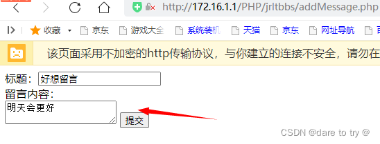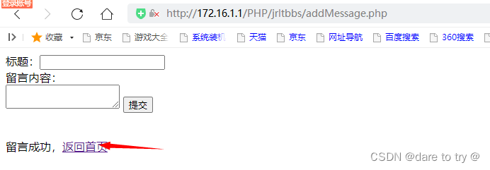 <?phpinclude "./inc/dblink.inc.php"http://將數據庫連接的文件包含到此文件中?><html><head><meta charset = "utf-8"><title>留言論壇</title></head><body><?phpif(isset($_COOKIE["name"])){ $html=<<<HTML <form method="post"> 標題:<input type="text" name="userTitle"><br/> 留言內容:<br/> <textarea name="userContent"></textarea> <input type="submit" name="userSubmit" value="提交"> </form>HTML; echo $html."<br>"; if(isset($_POST["userSubmit"]) && isset($_POST["userTitle"])){$userName=$_COOKIE["name"];$title=mysqli_real_escape_string($link,$_POST["userTitle"]) ;//將提交的文本進行轉義$content=mysqli_real_escape_string($link,$_POST["userContent"]);$sql="INSERT INTO `messages`( `uname`, `title`, `content`) VALUES ("".$userName."","".$title."","".$content."")";if($results=mysqli_query($link,$sql)){ echo "留言成功,<a href="./index.php">返回首頁</a>";}else{ echo mysqli_error($link);} }else{echo "請提交"; }}else{ echo "您還未登錄,<a href="./member/login.php">請登錄</a>";}?></body></html><?phpmysqli_close($link);?>4.4 測試