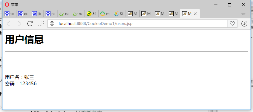 <%@ page language="java" import="java.util.*,java.net.*" contentType="text/html; charset=utf-8"%><%String path = request.getContextPath();String basePath = request.getScheme()+"://"+request.getServerName()+":"+request.getServerPort()+path+"/";%> <!DOCTYPE HTML PUBLIC "-//W3C//DTD HTML 4.01 Transitional//EN"><html> <head> <base href="<%=basePath%>" rel="external nofollow" rel="external nofollow" rel="external nofollow" > <title>My JSP "users.jsp" starting page</title> <meta http-equiv="pragma" content="no-cache"> <meta http-equiv="cache-control" content="no-cache"> <meta http-equiv="expires" content="0"> <meta http-equiv="keywords" content="keyword1,keyword2,keyword3"> <meta http-equiv="description" content="This is my page"> <!-- <link rel="stylesheet" type="text/css" href="styles.css" rel="external nofollow" rel="external nofollow" rel="external nofollow" > --> </head> <body> <h1>用戶(hù)信息</h1> <hr> <% request.setCharacterEncoding("utf-8"); String username=""; String password = ""; Cookie[] cookies = request.getCookies(); if(cookies!=null&&cookies.length>0) { for(Cookie c:cookies) { if(c.getName().equals("username")) { username = URLDecoder.decode(c.getValue(),"utf-8"); } if(c.getName().equals("password")) { password = URLDecoder.decode(c.getValue(),"utf-8"); } } } %> <BR> <BR> <BR> 用戶(hù)名:<%=username %><br> 密碼:<%=password %><br> </body></html>三 測(cè)試
