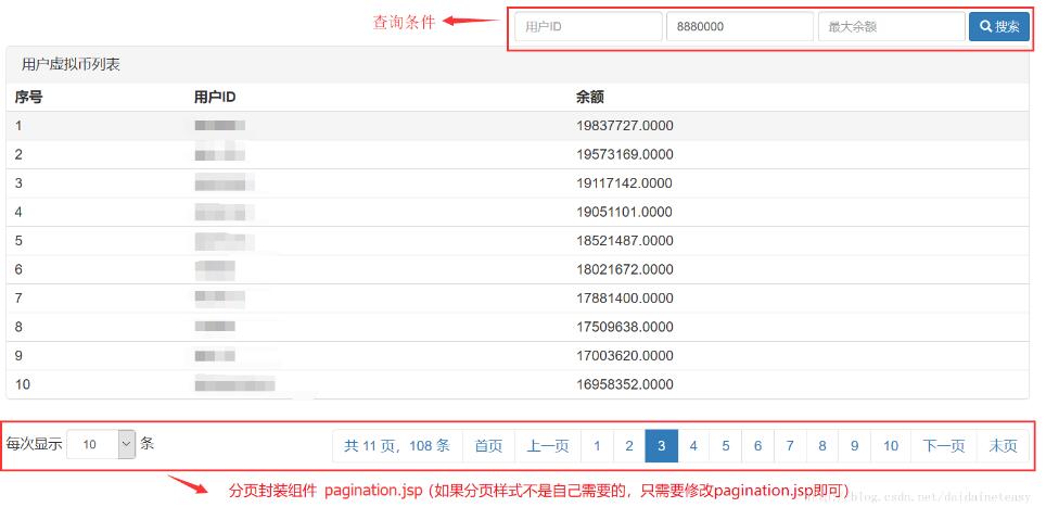 public List<UserMoney> getUserMoneyList(Page page, Map<String, Object> searchParams) { // 從map中獲取查詢條件 long userId = (Long) DataConvertUtil.data2(searchParams.get("userId"), DataConvertUtil.DataType.LONG); long minMoney = (Long) DataConvertUtil.data2( searchParams.get("minMoney"), DataConvertUtil.DataType.LONG); long maxMoney = (Long) DataConvertUtil.data2( searchParams.get("maxMoney"), DataConvertUtil.DataType.LONG); // 查詢總條數(shù) int totleElements = vasMoneyDao.getUserMoneyListCount( DataBaseName.DB_TATA_MONEY, userId, minMoney, maxMoney); // 設(shè)置總條數(shù) page.setTotleElements(totleElements); // 查詢需要展示的數(shù)據(jù) return vasMoneyDao.getUserMoneyList(DataBaseName.DB_TATA_MONEY, userId, minMoney, maxMoney, page.getStartNum(), page.getEndNum());}**每次需要分頁(yè),只需要操作上邊這兩步,是不是很簡(jiǎn)單啊~~。**接下來(lái),給大家貼出封裝的pagination.jsp代碼,和其它的一些幫助類的代碼。