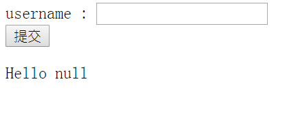 <form action="test.jsp"> username : <input type="text" name="username" /> <br /> <input type="submit"></form> Hello <%=request.getParameter("username")%>保存為test.jsp文件,啟動tomcat訪問,出現下圖: