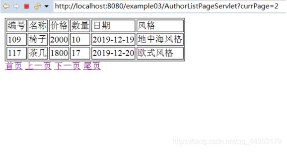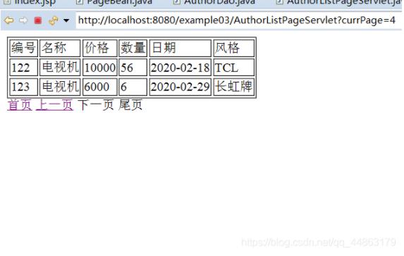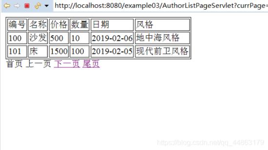 <%@ page language="java" contentType="text/html; charset=utf-8"? ? pageEncoding="utf-8"%><%@ taglib prefix="c" uri="http://java.sun.com/jsp/jstl/core" %><!DOCTYPE html><html><head><meta charset="utf-8"><title>查詢頁面</title></head><body><table border="1">? <tr>? ? <td>編號</td>? ? <td>名稱</td>? ? <td>價格</td>? ? <td>數(shù)量</td>? ? <td>日期</td>? ? <td>風(fēng)格</td>? </tr>? <c:forEach items="${pageBean.list}" var="author">? <tr>? ? <td>${author.id}</td>? ? <td>${author.name }</td>? ? <td>${author.price }</td>? ? <td>${author.num }</td>? ? <td>${author.dates}</td>? ? <td>${author.style}</td>? </tr>? </c:forEach></table><c:if test="${ pageBean.record>0}"><div>? ? ??? ? ? <c:if test="${pageBean.currentPage <= 1}">? ? ? <span>首頁</span>? ? ? <span>上一頁</span>? ? ? <a href ="AuthorListPageServlet?currPage=${pageBean.currentPage + 1 }">下一頁</a>? ? ? <a href ="AuthorListPageServlet?currPage=${pageBean.totalPage }">尾頁</a>? ? ? </c:if>? ? ??? ? ? <c:if test="${pageBean.currentPage > 1 && pageBean.currentPage < pageBean.totalPage ?}">? ? ? ?<a href ="AuthorListPageServlet?currPage=1">首頁</a>? ? ? <a href ="AuthorListPageServlet?currPage=${pageBean.currentPage - 1 }">上一頁</a>? ? ? <a href ="AuthorListPageServlet?currPage=${pageBean.currentPage + 1 }">下一頁</a>? ? ? <a href ="AuthorListPageServlet?currPage=${pageBean.totalPage }">尾頁</a>? ? ? </c:if>? ? ?? ? ?<c:if test="${ pageBean.currentPage >= pageBean.totalPage}">? ? ? <a href ="AuthorListPageServlet?currPage=1">首頁</a>? ? ? <a href ="AuthorListPageServlet?currPage=${pageBean.currentPage - 1 }">上一頁</a>? ? ?<span>下一頁</span>? ? ?<span>尾頁</span>? ? ?</c:if></div></c:if></body></html>(3)功能實現(xiàn):AuthorDao.java。