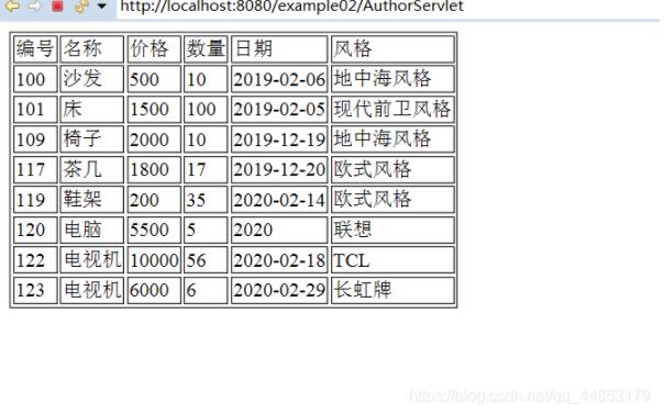 <%@ page language="java" contentType="text/html; charset=utf-8"? ? pageEncoding="utf-8"%><%@ taglib prefix="c" uri="http://java.sun.com/jsp/jstl/core" %><!DOCTYPE html><html><head><meta charset="utf-8"><title>查詢信息顯示頁面</title></head><body><table border="1">? <tr>? ? ? ? ?<td>編號</td>? ? ? ? ?<td>名稱</td>? ? ? ? ?<td>價格</td>? ? ? ? ?<td>數量</td>? ? ? ? ?<td>日期</td>? ? ? ? ?<td>風格</td>? </tr>??? ?<c:forEach items="${authorList}" var="author">? <tr>? ? <td>${author.id}</td>? ? <td>${author.name }</td>? ? <td>${author.price }</td>? ? <td>${author.num }</td>? ? <td>${author.dates}</td>? ? <td>${author.style}</td>? </tr>? </c:forEach></table></body></html>(4)定義一個Author類,用于接收數據庫中的元素。