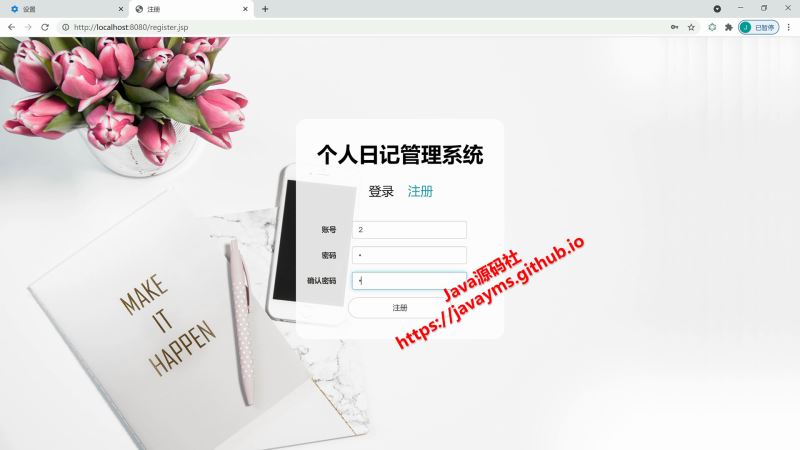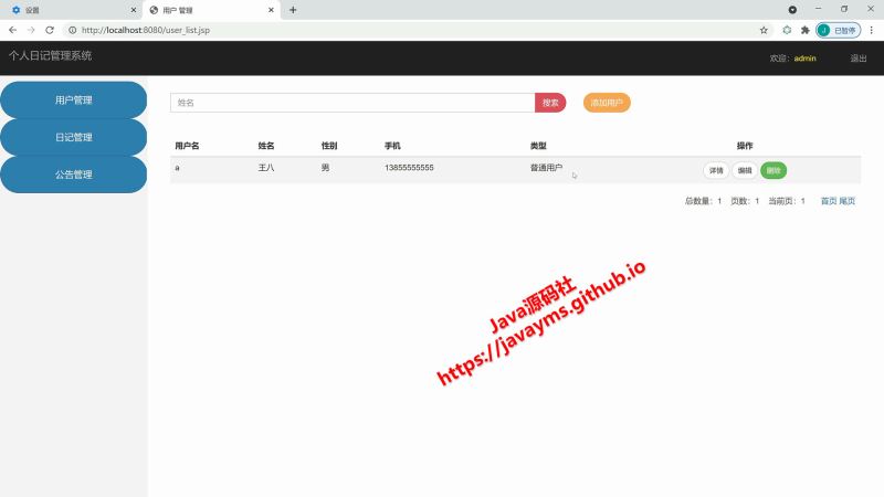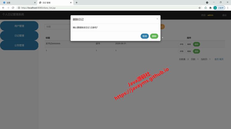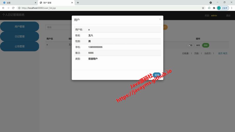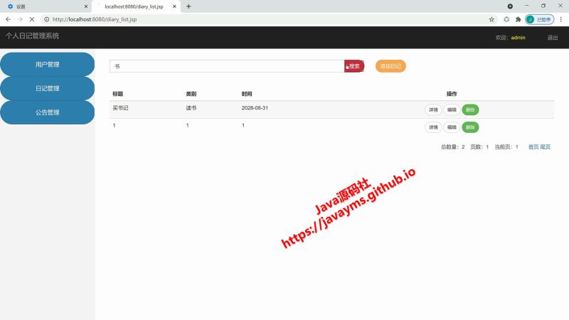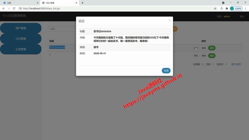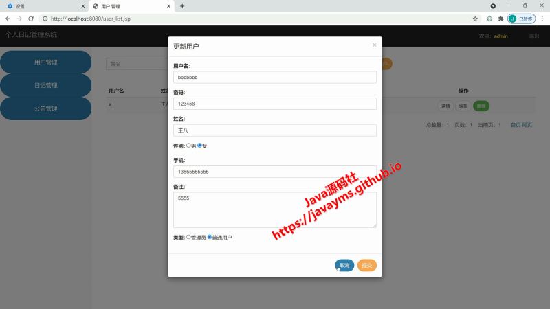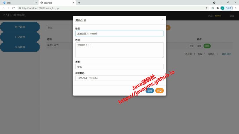 登錄、注冊、退出、用戶模塊、公告模塊、日記模塊的增刪改查管理