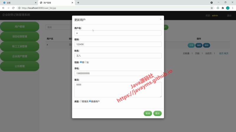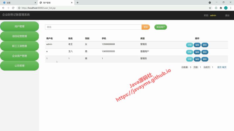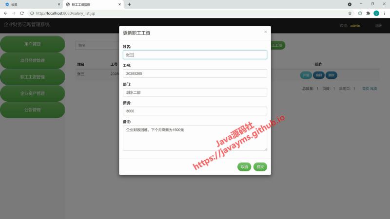 登錄、注冊、退出、用戶模塊、公告模塊、職工工資模塊、企業資產模塊、項目經營模塊的增刪改查管理