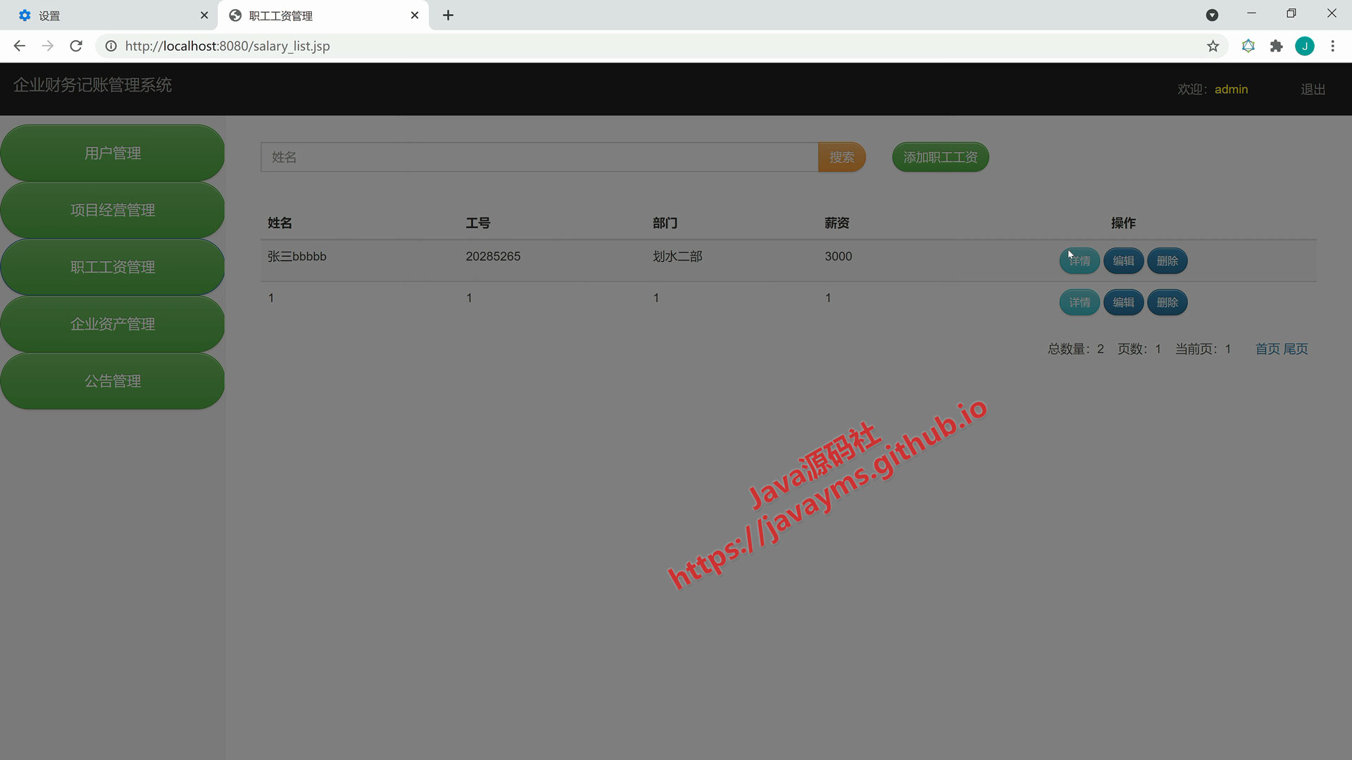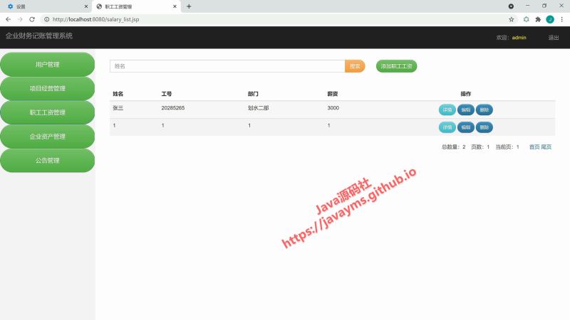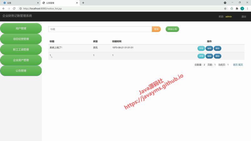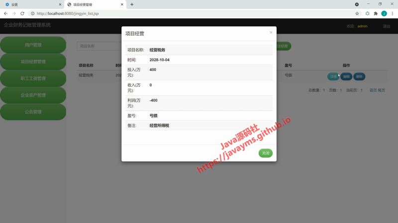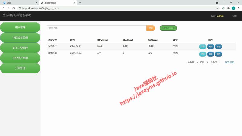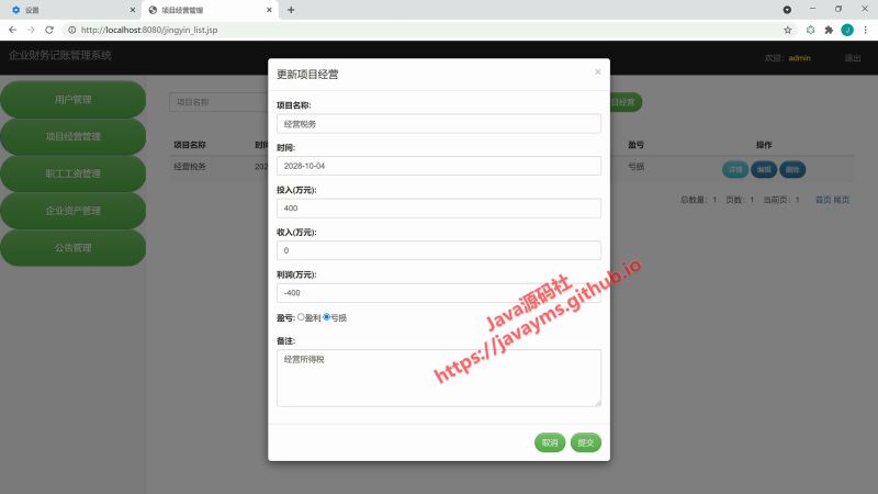 modal.find("#edit-jingyinLirun").val(vo.jingyinLirun);for (let val of "盈利/虧損".split("/")) { if (val == vo.jingyinStatus) {modal.find("#edit-jingyinStatus_" + vo.jingyinStatus).prop("checked", true); } else {modal.find("#edit-jingyinStatus_" + vo.jingyinStatus).removeAttr("checked"); }};modal.find("#edit-jingyinText").val(vo.jingyinText); }}) }) $("#modal-info").on("show.bs.modal", function (event) {let button = $(event.relatedTarget);let id = button.data("id");let modal = $(this);$.ajax({ url: "JingyinServlet?action=get&id=" + id, type: "get",<div> <button type="button" <c:if test="${loginUser.userType != "管理員"}">disabled="disabled" title="沒有權限?。?!"</c:if> data-toggle="modal" data-target="#modal-add">添加項目經營 </button></div> </div> <br> <br> <div><table> <thead> <tr> <th>項目名稱</th><body><nav> <div><div> <button type="button" data-toggle="collapse" data-target="#navbar" aria-expanded="false" aria-controls="navbar"><span>企業財務記賬管理系統</span> <span></span><span></span> <span></span> </button> <a href="#" rel="external nofollow" rel="external nofollow" >企業財務記賬管理系統</a></div><div id="navbar"> <ul><li><a href="#" rel="external nofollow" rel="external nofollow" >歡迎:<span>${loginUser.username}</span></a></li> function addCheck() {//根據ID獲取值if (document.getElementById("add-jingyinName").value.trim().length == 0) { alert("項目名稱不能為空"); return false;}if (document.getElementById("add-jingyinDate").value.trim().length == 0) { alert("時間不能為空"); return false;}if (document.getElementById("add-jingyinTou").value.trim().length == 0) { alert("投入(萬元)不能為空"); return false;}</div><div> <button type="button" data-dismiss="modal">取消</button> <button type="submit">刪除</button></div> </form></div> </div></div></body><script> $("#modal-delete").on("show.bs.modal", function (event) {let button = $(event.relatedTarget);let id = button.data("id");let modal = $(this);modal.find("#delete-id").val(id); }) alert("收入(萬元)不能為空"); return false;}if (document.getElementById("add-jingyinLirun").value.trim().length == 0) { alert("利潤(萬元)不能為空"); return false;}return true; } //編輯表單提交之前進行檢查,如果return false,則不允許提交 function editCheck() {//根據ID獲取值if (document.getElementById("edit-jingyinName").value.trim().length == 0) { alert("項目名稱不能為空"); return false;}if (document.getElementById("edit-jingyinDate").value.trim().length == 0) { alert("時間不能為空");效果圖