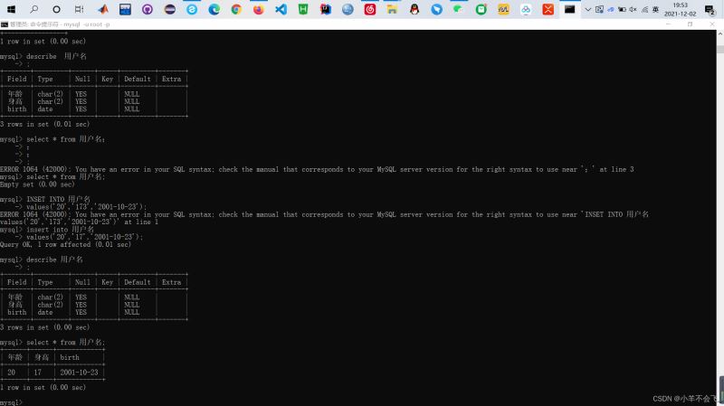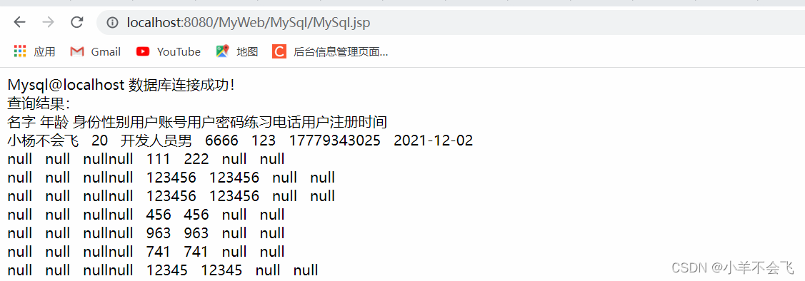 <%@ page language="java" contentType="text/html; charset=UTF-8" pageEncoding="UTF-8"%><%@ page import="java.sql.*"%><!DOCTYPE html><html><head> <meta charset="UTF-8"> <title>Insert title here</title></head><body><% try {Class.forName("com.mysql.jdbc.Driver"); 驅動程序名//com.mysql.jdbc.cj.Driver也是OK的String url = ""; //數據庫名 ?后面的是為了指定字符的編碼、解碼格式。String username = "root"; //數據庫用戶名String password = "123456"; //數據庫用戶密碼Connection conn = DriverManager.getConnection(url, username, password); //連接狀態 if(conn != null){ out.println("數據庫連接成功!"); out.print("<br />"); Statement stmt = null; ResultSet rs = null; String sql = "SELECT *FROM 用戶名;"; //查詢語句 stmt = conn.createStatement(); rs = stmt.executeQuery(sql); out.print("查詢結果:"); out.print("<br />"); out.println("名字"+" "+"年齡 "+" "+"身份"+"性別"+"用戶賬號"+"用戶密碼"+"練習電話"+"用戶注冊時間"); out.print("<br />"); while (true) {try { if (!rs.next()) break; out.println(rs.getString("名字")+"   "+rs.getString("年齡")+"   "+rs.getString("身份")+rs.getString("性別")+"   "+rs.getString("用戶賬號")+"   "+rs.getString("用戶密碼")+"   " +rs.getString("聯系電話")+"   "+rs.getString("用戶注冊時間")+"   "); //將查詢結果輸出 out.print("<br/>");} catch (SQLException throwables) { throwables.printStackTrace();}//out.println(rs.getString("名字")+"   "+rs.getString("年齡")+"   "+rs.getString("身份")+rs.getString("性別")+"   "+rs.getString("用戶賬號")+"   "+rs.getString("用戶密碼")+"   "http://+rs.getString("聯系電話")+"   "+rs.getString("用戶注冊時間")+"   "); //將查詢結果輸出//out.print("<br/>"); }}else{ out.print("連接失敗!");} } catch (ClassNotFoundException e) {e.printStackTrace(); }// catch (SQLException e)// {//e.printStackTrace();// }%></body></html>連接成功,頁面顯示如下