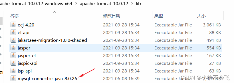 首先要將mysql-connector-java-5.0.8-bin.jar 拷到apache-tomcat-10.0.12-windows-x64\apache-tomcat-10.0.12\lib文件目錄下