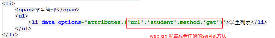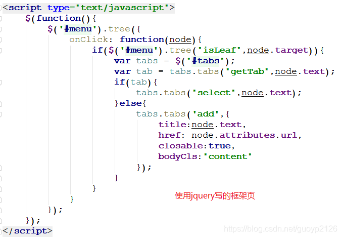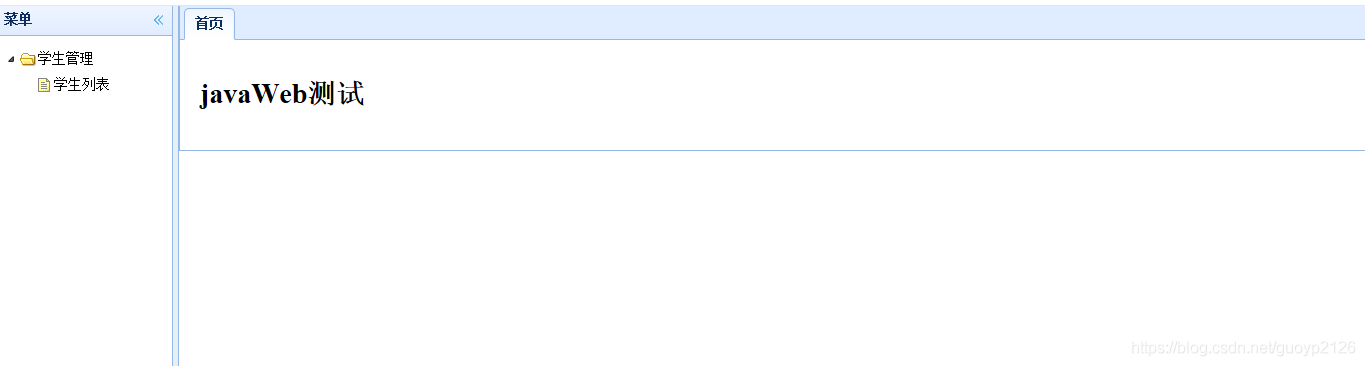 <%@ page contentType="text/html;charset=UTF-8" language="java" %><html><head> <meta charset="UTF-8"> <title>歡迎頁面</title> <link rel="stylesheet" type="text/css" href="js/themes/default/easyui.css" rel="external nofollow" > <link rel="stylesheet" type="text/css" href="js/themes/icon.css" rel="external nofollow" > <link rel="stylesheet" type="text/css" href="js/demo.css" rel="external nofollow" > <script type="text/javascript" src="js/jquery.min.js"></script> <script type="text/javascript" src="js/jquery.easyui.min.js"></script> <style type="text/css">.content { padding: 10px 10px 10px 10px;} </style></head><body><div data-options="region:"west",title:"菜單",split:true"> <ul id="menu"><li> <span>學(xué)生管理</span> <ul><li data-options="attributes:{"url":"student",method:"get"}">學(xué)生列表</li> </ul></li> </ul></div><div data-options="region:"center",title:"""> <div id="tabs"><div title="首頁"> <h1>javaWeb測試</h1></div> </div></div></body></html><script type="text/javascript"> $(function(){$("#menu").tree({ onClick: function(node){if($("#menu").tree("isLeaf",node.target)){ var tabs = $("#tabs"); var tab = tabs.tabs("getTab",node.text); if(tab){tabs.tabs("select",node.text); }else{tabs.tabs("add",{ title:node.text, href: node.attributes.url, closable:true, bodyCls:"content"}); }} }}); });</script>核心代碼說明: