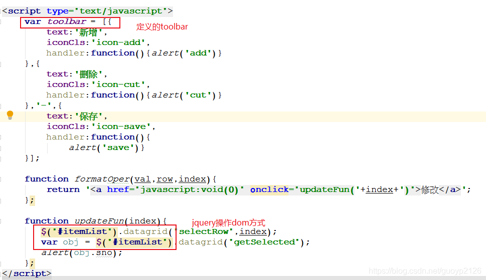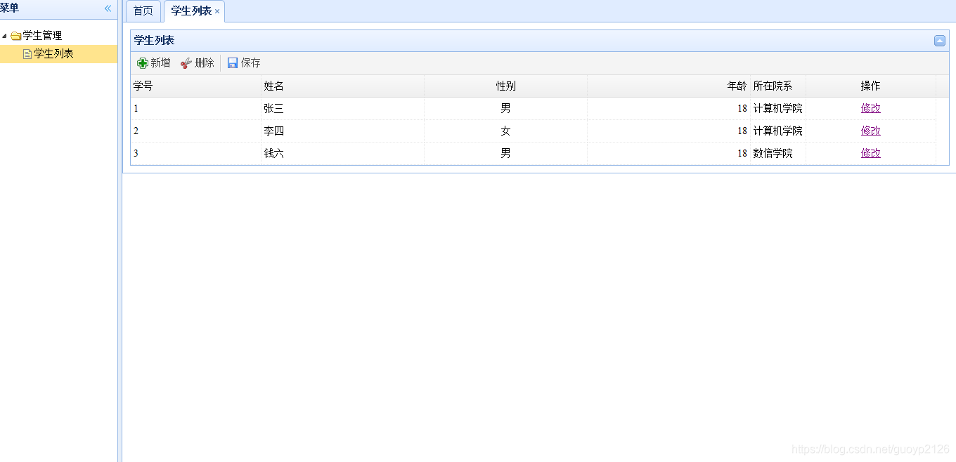 <%@ page contentType="text/html;charset=UTF-8" language="java" %><table id="itemList" title="學(xué)生列表" opts.striped="true" fitColumns="true" data-options="singleSelect:true,collapsible:true,url:"student",method:"post",toolbar:toolbar"> <thead> <tr><th data-options="field:"sno",width:80">學(xué)號</th><th data-options="field:"sName",width:100,align:"left"">姓名</th><th data-options="field:"sSex",width:100,align:"center"">性別</th><th data-options="field:"sAge",width:100,align:"right"">年齡</th><th data-options="field:"sDept",align:"left"">所在院系</th><th data-options="field:"operation",width:80,align:"center",formatter:formatOper">操作</th> </tr> </thead></table><script type="text/javascript"> var toolbar = [{text:"新增",iconCls:"icon-add",handler:function(){alert("add")} },{text:"刪除",iconCls:"icon-cut",handler:function(){alert("cut")} },"-",{text:"保存",iconCls:"icon-save",handler:function(){ alert("save")} }]; function formatOper(val,row,index){return "<a href="javascript:void(0)" rel="external nofollow" οnclick="updateFun("+index+")">修改</a>"; }; function updateFun(index){ $("#itemList").datagrid("selectRow",index); var obj = $("#itemList").datagrid("getSelected"); alert(obj.sno); };</script>這個(gè)jsp中的代碼并不是一個(gè)完整的jsp頁面,更類似一個(gè)div中的內(nèi)容。關(guān)鍵代碼如下
