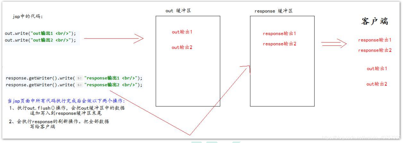 不管out語句在response語句的上面還是下面,輸出時總是response語句的內容在上面,因為在向客戶端輸出時,out緩沖區中的內容會追加到response緩沖區中,統一輸出。