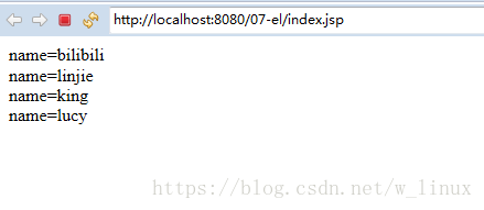 <%@page import="java.util.*"%><%@ page language="java" contentType="text/html; charset=UTF-8" pageEncoding="UTF-8"%><!DOCTYPE html PUBLIC "-//W3C//DTD HTML 4.01 Transitional//EN" "http://www.w3.org/TR/html4/loose.dtd"><html><head><meta http-equiv="Content-Type" content="text/html; charset=UTF-8"><title>Insert title here</title></head><body> <% List<String> names=new ArrayList<String>(); names.add("xlj"); names.add("lucy"); pageContext.setAttribute("names", names); %> <!-- 因?yàn)長ist底層是數(shù)組,所以可以這樣寫 --> names[1]=${names[1] }<br></body></html>客戶瀏覽器顯示結(jié)果