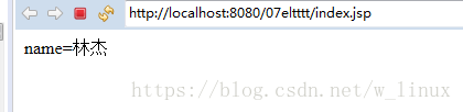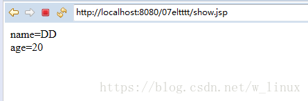 <%@ page language="java" contentType="text/html; charset=UTF-8" import="linjie.com.Demo" pageEncoding="UTF-8"%><!DOCTYPE html PUBLIC "-//W3C//DTD HTML 4.01 Transitional//EN" "http://www.w3.org/TR/html4/loose.dtd"><html><head><meta http-equiv="Content-Type" content="text/html; charset=UTF-8"><title>Insert title here</title></head><body> <% Demo test=new Demo("linjie",12); request.setAttribute("ELttt", test); %> name=${requestScope.ELttt.name }<br> age=${requestScope.ELttt.age }<br> <!-- 若訪問為null的對象的屬性,EL是不會(huì)拋出空指針異常的,只是不顯示而已 --> names=${requestScope.ELtttxx.name }<br></body></html>客戶瀏覽器顯示結(jié)果
