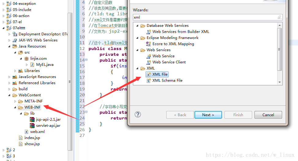package linjie.com;//自定義函數(shù)//該類及其函數(shù),需要在擴(kuò)展名為.tld的xml文件中注冊//tld:tag library definition(標(biāo)簽庫定義)//xml文件是需要約束的,即需要配置文件頭部。這個(gè)頭部約束可以從一下文件中進(jìn)行復(fù)制//在Tomcat安裝目錄下:webapps\examples\WEB-INF\jsp2//文件為:jsp2-example-taglib.tld//這個(gè).tld的xml文件,需要定義在當(dāng)前web項(xiàng)目的WEB-INF目錄下,在此目錄下創(chuàng)建以.tld結(jié)尾的xml文件//將jsp2-example-taglib.tld中頭部復(fù)制到創(chuàng)建的xml文件中//再將函數(shù)注冊,還是在jsp2-example-taglib.tld底部中復(fù)制public class MyEL { private static MyEL instance; public static MyEL getInstance() { if(instance==null) { instance=new MyEL(); } return instance; } //字符串小寫變大寫 public static String LowerToUpper(String str) { return str.toUpperCase(); }}2、將jsp2-example-taglib.tld中頭部部分以及底部的注冊函數(shù)部分復(fù)制到自己創(chuàng)建的tld(在WEB-INF下)文件中