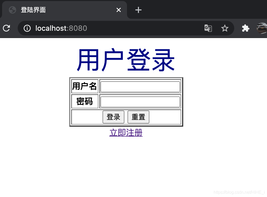 <!DOCTYPE html><html lang="en"><head> <meta charset="UTF-8"> <title>登陸界面</title></head><body><div align="center"> <font size="10px" color="#00008b">用戶登錄</font> <form action="/login" method="post"> <table border="2"> <tr> <th>用戶名</th> <td><input type="text" name="userName"/></td> </tr> <tr> <th>密碼</th> <td><input type="password" name="password"/></td> </tr> <tr> <td colspan="2" align="center"> <input type="submit" value="登錄"/> <input type="reset" /> </td> </tr> </table> </form> <a href="/jsp/register.jsp">立即注冊</a></div></body></html>