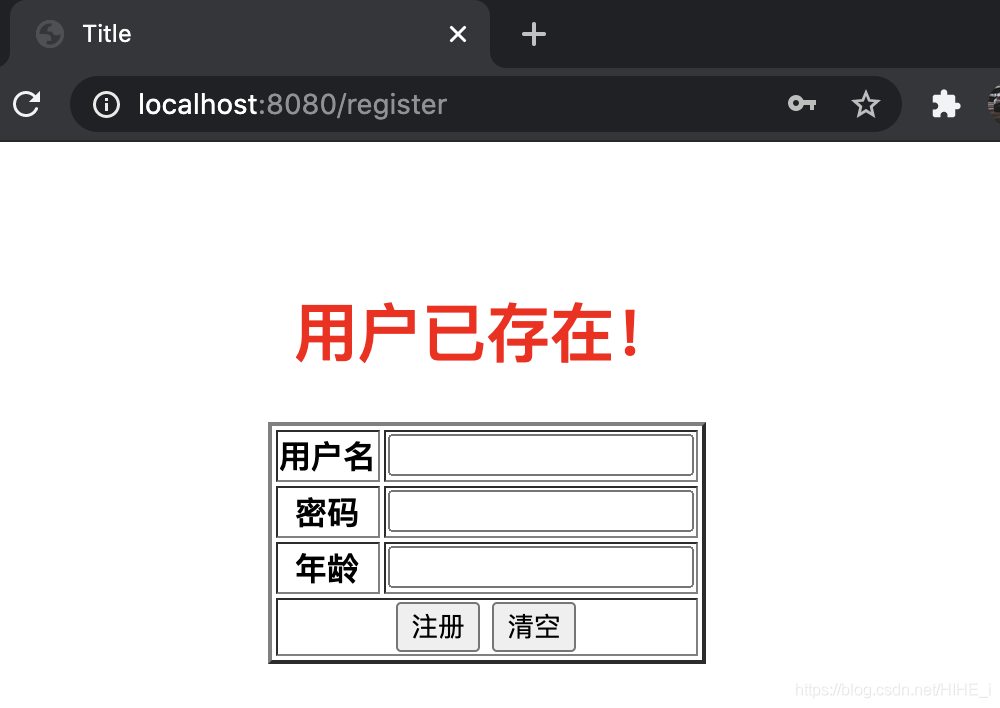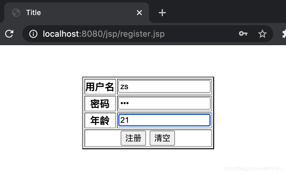 <%@ page import="entity.User" %><%@ page contentType="text/html;charset=UTF-8" language="java" %><html><head> <title>查詢頁面</title></head><body><div align="center"> <h2/>輸入用戶名,查詢信息 <form action="/findByName" method="get"> <input type="text" name="name" id="name"> <input type="submit" value="查詢"> </form> <% User userInfo = (User) request.getAttribute("userInfo"); %> <% if (userInfo != null) { %> <table border="3"> <tr> <th>用戶名</th> <th>密碼</th> <th>年齡</th> </tr> <tr> <td> <%=userInfo.getName()%> </td> <td> <%=userInfo.getPassword()%> </td> <td> <%=userInfo.getAge()%> </td> </tr> </table> <% } %></div></body></html>register.jsp