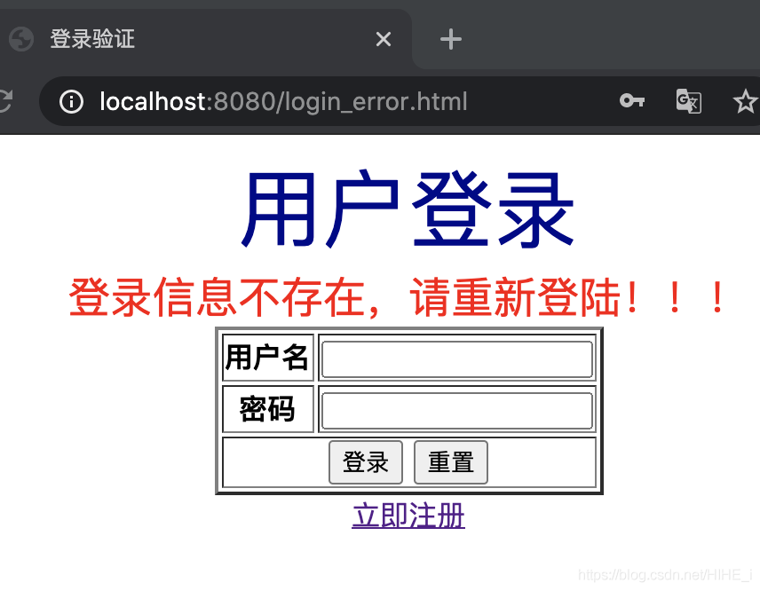 <!DOCTYPE html><html lang="en"><head> <meta charset="UTF-8"> <title>登錄驗證</title></head><body><div align="center"> <font size="10px" color="#00008b">用戶登錄</font><br> <font size="5px" color="red">登錄信息不存在,請重新登陸!!!</font> <form action="/login" method="post"> <table border="2"> <tr> <th>用戶名</th> <td><input type="text" name="userName" /></td> </tr> <tr> <th>密碼</th> <td><input type="password" name="password" /></td> </tr> <tr> <td colspan="2" align="center"> <input type="submit" value="登錄"/> <input type="reset"> </td> </tr> </table> </form> <a href="/jsp/register.jsp">立即注冊</a></div></body></html>