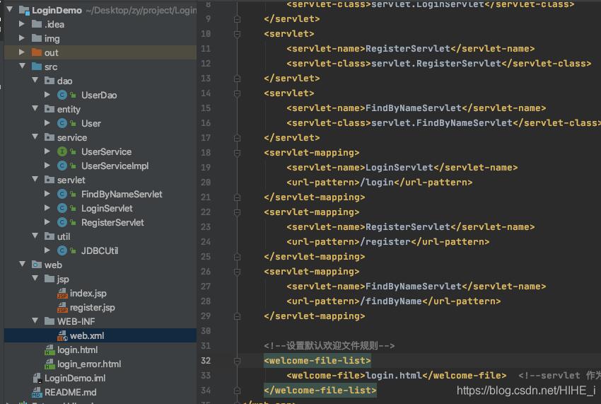 <?xml version="1.0" encoding="UTF-8"?><web-app xmlns="http://xmlns.jcp.org/xml/ns/javaee" xmlns:xsi="http://www.w3.org/2001/XMLSchema-instance" xsi:schemaLocation="http://xmlns.jcp.org/xml/ns/javaee http://xmlns.jcp.org/xml/ns/javaee/web-app_4_0.xsd" version="4.0"> <servlet> <servlet-name>LoginServlet</servlet-name> <servlet-class>servlet.LoginServlet</servlet-class> </servlet> <servlet> <servlet-name>RegisterServlet</servlet-name> <servlet-class>servlet.RegisterServlet</servlet-class> </servlet> <servlet> <servlet-name>FindByNameServlet</servlet-name> <servlet-class>servlet.FindByNameServlet</servlet-class> </servlet> <servlet-mapping> <servlet-name>LoginServlet</servlet-name> <url-pattern>/login</url-pattern> </servlet-mapping> <servlet-mapping> <servlet-name>RegisterServlet</servlet-name> <url-pattern>/register</url-pattern> </servlet-mapping> <servlet-mapping> <servlet-name>FindByNameServlet</servlet-name> <url-pattern>/findByName</url-pattern> </servlet-mapping> <!--設置默認歡迎文件規則--> <welcome-file-list> <welcome-file>login.html</welcome-file> <!--servlet 作為默認歡迎文件 ‘/"需要去掉--> </welcome-file-list></web-app>