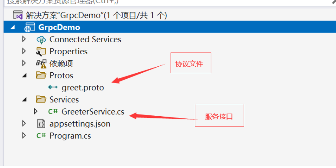1.使用vs首先創(chuàng)建一個(gè)NetCore gRPC項(xiàng)目,得到一個(gè)項(xiàng)目結(jié)構(gòu)如下,框架默認(rèn)包含一個(gè)已經(jīng)預(yù)先定義的協(xié)議文件和服務(wù)接口,如果使用其他的方式也很簡(jiǎn)單直接引用相關(guān)的包,然后添加以下服務(wù)就可以了