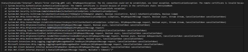 public class gRPCTestController : ControllerBase { private readonly MyTestDemoClient _client; public gRPCTestController(MyTestDemoClient client) { _client = client; } [HttpGet(Name = "Excute")] public async Task<string> Get() { var a = await _client.NoParamAsync(new Google.Protobuf.WellKnownTypes.Empty()); var str = a.Success.ToString(); return str; } }5.調(diào)用出現(xiàn)如下問(wèn)題 ,使用dotnet dev-certs https --trust
