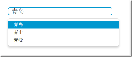 public ActionResult GetCitiesJson(){ var result = new List<City>() {new City(){Id = 1, Name = "青島",PinYin = "qingdao"},new City(){Id = 10, Name = "青山",PinYin = "qingshan"},new City(){Id = 11, Name = "青峰",PinYin = "qingfeng"},new City(){Id = 2, Name = "武漢",PinYin = "wuhan"},new City(){Id = 3, Name = "煙臺",PinYin = "yantai"},new City(){Id = 4, Name = "哈爾濱",PinYin = "haerbing"},new City(){Id = 5, Name = "北京",PinYin = "beijing"},new City(){Id = 6, Name = "安陽",PinYin = "angyang"},new City(){Id = 7, Name = "長春",PinYin = "changchun"},new City(){Id = 8, Name = "東陽",PinYin = "dongyang"},new City(){Id = 9, Name = "葛洲壩",PinYin = "gezhoubei"} }; return Json(result,JsonRequestBehavior.AllowGet);}在視圖中先加載City集合,再使用預先輸入功能。