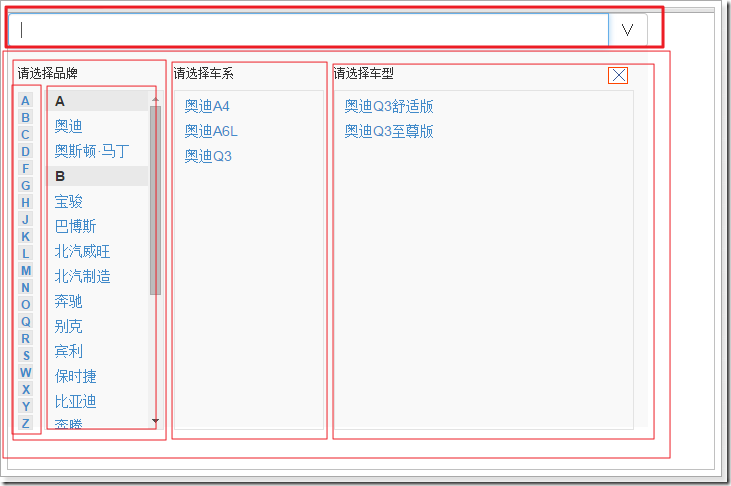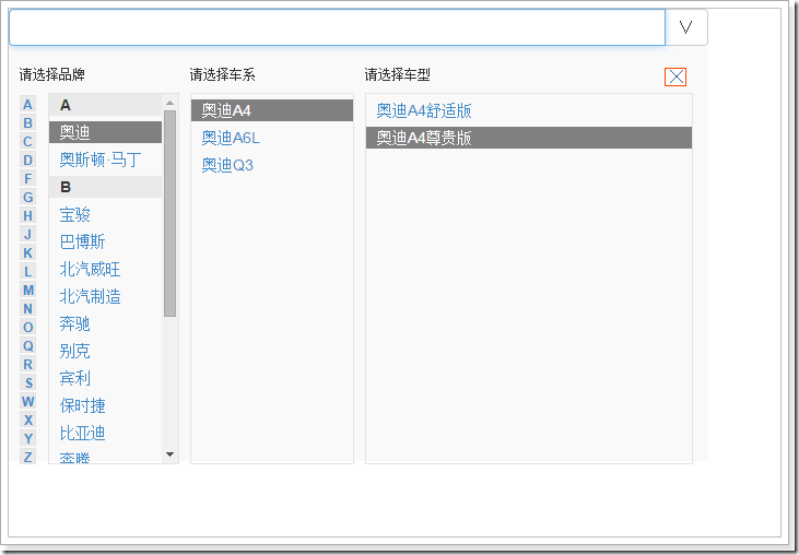 #carcategory-picker-outer { background: #f9f9f9; padding: 10px; width: 640px; height: 380px; position: relative; display: none;}#PreLetter { border: 0px solid blue; width: 21px; float: left;}#PreLetter a:link{ display: block; text-decoration: none; clear: both; font-size: 10px; text-align: center; padding-top: 0px; border: 1px solid #e3e3e3; width: 15px; height: 15px; background-color: #e9e9e9; margin-top: 2px; font-weight: bold;}#PreLetter a:hover { border: 1px solid blue;}#PreLetter a:visited { border: 1px solid #e3e3e3;}#pinpai { border: 0px solid green; float: left;}#AllPinPai { border: 1px solid #e3e3e3; margin-left: 5px; float: left; padding-bottom: 0px; width: 120px; height: 340px; overflow-y: auto;}#AllPinPai dl dd a { text-decoration: none; display: block; padding-left: 10px;}#AllPinPai dl dd { padding-left: 0px;}#AllPinPai dl dd a:hover { /*background-color: gray;*/ color: white;}#AllPinPai dl { margin-bottom: 5px;}#chexi { border: 0px solid orange; float: left; margin-left: 10px; display: none;}#AllCheXi { width: 150px; height: 340px; overflow-y: auto; border: 1px solid #e3e3e3;}#AllCheXi dl dd a { text-decoration: none; display: block; padding-left: 10px;}#AllCheXi dl dd { padding-left: 0px;}#AllCheXi dl dd a:hover { color: white;}#AllCheXi dl { margin-bottom: 5px;}#chexin { border: 0px solid red; float: left; margin-left: 10px; display: none;}#AllCheXing { width: 300px; height: 340px; overflow-y: auto; border: 1px solid #e3e3e3; }#AllCheXing dl dd a { text-decoration: none; display: block; padding-left: 10px;}#AllCheXing dl dd { padding-left: 0px;}#AllCheXing dl dd a:hover { background-color: gray; color: white;}#AllCheXing dl { margin-bottom: 5px;}dt { background-color: #e9e9e9; padding-left: 10px;}dl { border: 0px solid red;}dd { padding-left: 10px; line-height: 15px; margin-top: 5px; margin-bottom: 0px; border: 0px solid blue; /*background-color: gray;*/}.selected { background-color: gray; color: white;}.cancel { width: 20px; height: 17px; position: absolute; display: block; top: 20px; right: 20px; background-image: url("../img/close.png"); border: 1px solid orangered; background-color: orangered;}.input-group { width: 640px;}以上就是這篇文章的全部內(nèi)容了,希望本文的內(nèi)容對大家的學習或者工作具有一定的參考學習價值,謝謝大家對的支持。如果你想了解更多相關內(nèi)容請查看下面相關鏈接
