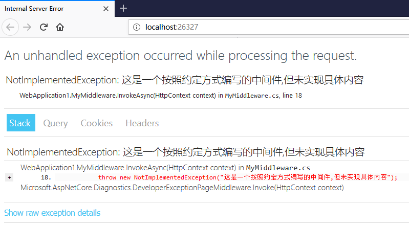 // Startup.csusing Microsoft.AspNetCore.Builder;using Microsoft.AspNetCore.Hosting;using Microsoft.AspNetCore.Http;using Microsoft.Extensions.DependencyInjection;using System;namespace WebApplication1{ public class Startup {public void ConfigureServices(IServiceCollection services){}public void Configure(IApplicationBuilder app, IHostingEnvironment env){ if (env.IsDevelopment()) {app.UseDeveloperExceptionPage(); } // 使用匿名函數實現一個內聯中間件 app.Use(async (context, next) => {throw new NotImplementedException("一個使用匿名函數,但未實現具體內容的內聯中間件"); }); app.Run(async (context) => {await context.Response.WriteAsync("Hello World!"); });} }}這里我們在 app.Run 之前使用 app.Use 添加一個匿名函數實現的內聯中間件,按照中間件的注冊順序,當發起請求時,會拋出一個異常 NotImplementedException("一個使用匿名函數,但未實現具體內容的內聯中間件")