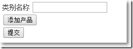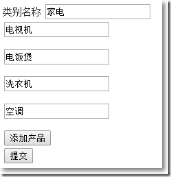 @model AddingMultipleNestedData.Models.Category @{ ViewBag.Title = "Index"; Layout = "~/Views/Shared/_Layout.cshtml";} @using (Html.BeginForm("Create", "Home", FormMethod.Post, new {id = "addForm"})){ <div>@Html.LabelFor(m => m.Name)@*@Html.EditorFor(m => m.Name)*@@Html.TextBox("Category.Name") </div> <div id="products"></div> <div><input id="btnAddProduct" type="button" value="添加產品"/> </div> <div><input type="submit" value="提交"/> </div>} @section scripts{ <script type="text/javascript">$(function() { var noOfProducts = 0; $("#btnAddProduct").click(function() {var product = getNestedName("Category.Products", noOfProducts);noOfProducts++;$("#products").append("<input type="text" name=""+product+".Name" /><p>"); }); }); function getNestedName(itemName, itemNumber) { return (itemName + "[" + itemNumber + "]");} </script>}沒有添加產品前:
