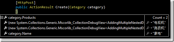 前臺視圖使用jquery動態生成input,并把input的name屬性設置成Category.Products[i].Name格式。