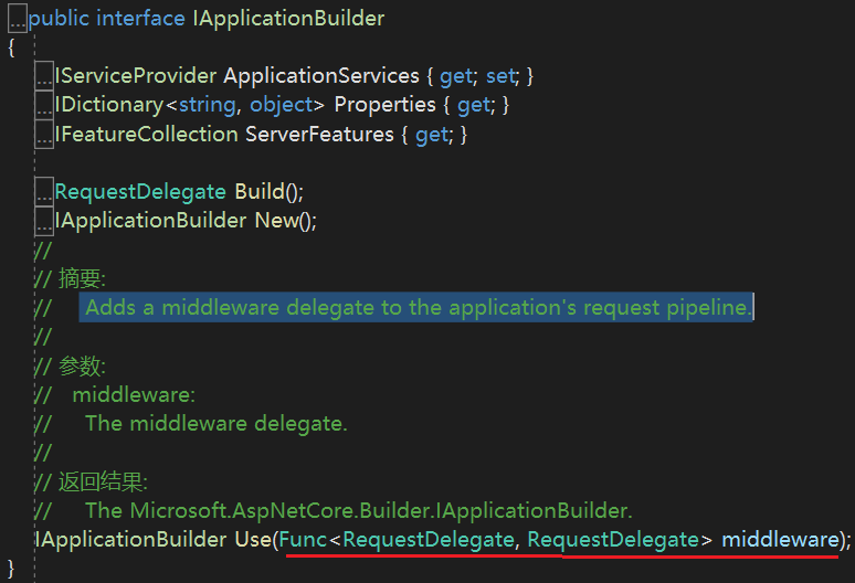 在應(yīng)用程序代碼中,我們可以從用于注冊(cè)中間件的Use方法中看出,所謂管道中的中間件其實(shí)就是一種委托類型的對(duì)象,這個(gè)具體的委托對(duì)象體現(xiàn)為“Fun<RequestDelegate,RequestDelegate>”。
