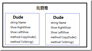 拷貝后,2個Dude的Shoe類型的屬性指向了同一個托管堆內(nèi)的Shoe實例,改變Shoe的值會同時影響到2個Dude。