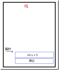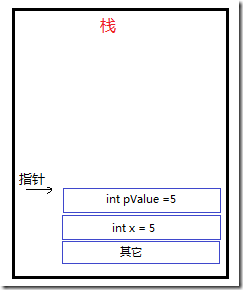 2、開始執行AddFive()方法,值類型變量pValue被放到"棧"上,并把x的值賦值給pValue,pValue的值變成了5。